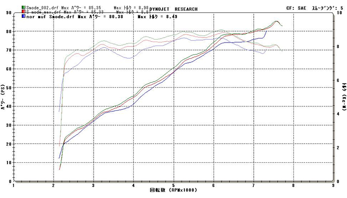 ほぼ全域にわたり、純正マフラーに比べてパワー、トルク共にアップします。