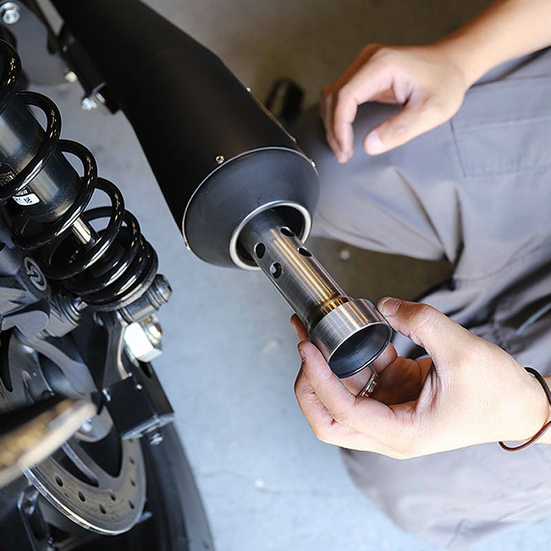 バッフルはサイレンサーエンド部分の下部のボルト一本で脱着出来る様になっていて、取り付けはマフラーを車体に装着した状態で出来る為作業性の高さも魅力の一つです♪