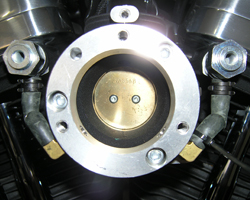 両側の固定ボルト部から出てくるブローバイガスは、ネジ内の穴からホースを通して吸気の負圧でエンジン内に送られていく。