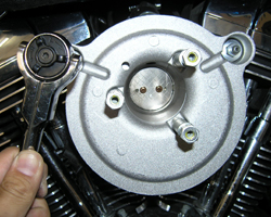 エアクリーナーをハイフロータイプに交換すると、ノーマルのエアクリーナーはバックプレートからすべて外す物が多い。