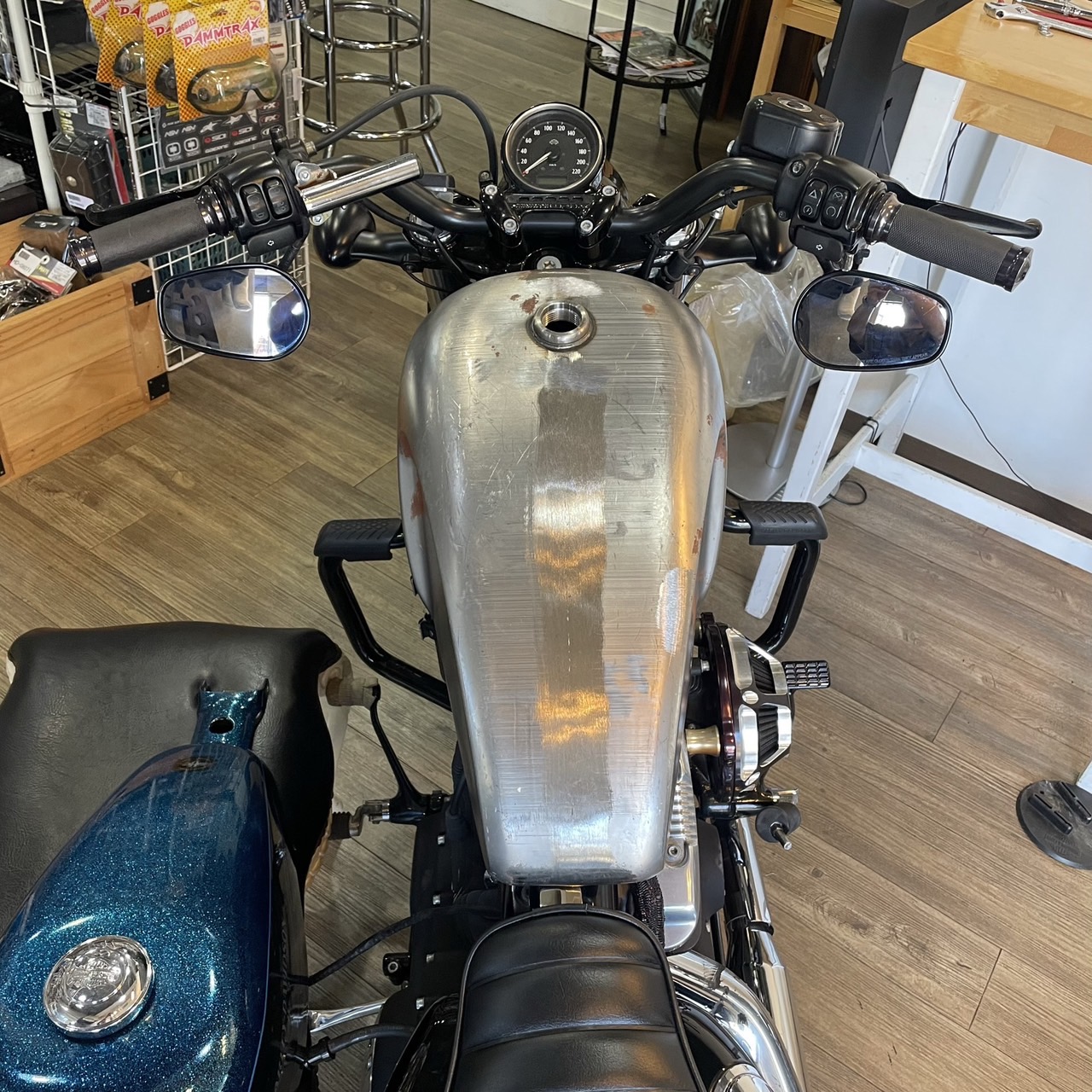 39ミリフォーク車両に比べて、フロントエンドが無骨で肉厚なXL1200X(フォーティーエイト)にレガシータンクを装着すると見え方が全く変わる。