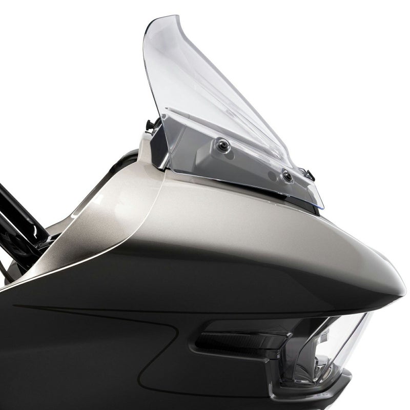 2023以降 CVOロードグライド、2024以降 ロードグライド用 ウィンドシールドです。 <特長> ●センター部分が一段高い、人目を引くルックスとエアフローの整流効果を両立 ●新デザインのシャークノーズフェアリングにマッチするシェイプ ●先端の反りによる整流効果でライダーへの防風効果がアップ、ライダーのヘルメットバイザーへの風圧を最大50%低減します(個人の身長による) ●風切り音の低減効果で走行中オーディオを聴きやすくなります ●頑丈なポリカーボネイト製。傷防止用コーティング処理済み ●ノーマルウィンドシールドと交換するだけの簡単装着 ●ハーレーダビッドソンのロゴ文字入り