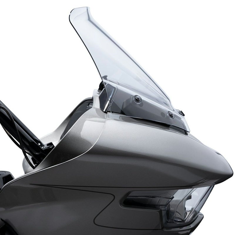2023以降 CVOロードグライド、2024以降 ロードグライド用 ウィンドシールドです。 <特長> ●センター部分が一段高い、人目を引くルックスとエアフローの整流効果を両立 ●新デザインのシャークノーズフェアリングにマッチするシェイプ ●先端の反りによる整流効果でライダーへの防風効果がアップ、ライダーのヘルメットバイザーへの風圧を最大50%低減します(個人の身長による) ●風切り音の低減効果で走行中オーディオを聴きやすくなります ●頑丈なポリカーボネイト製。傷防止用コーティング処理済み ●ノーマルウィンドシールドと交換するだけの簡単装着 ●ハーレーダビッドソンのロゴ文字入り