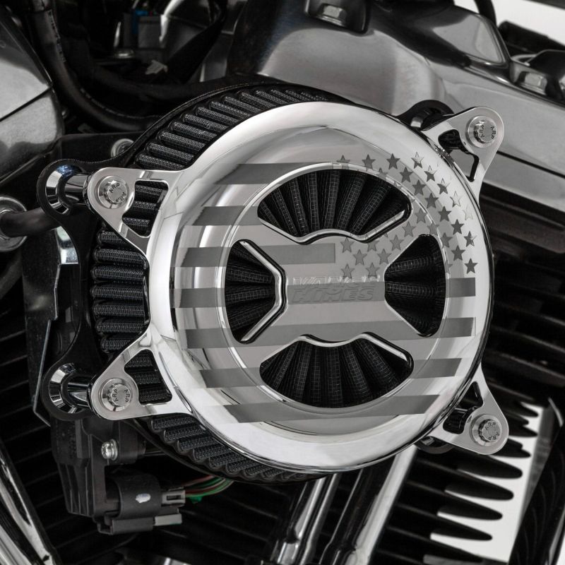 ハーレー ツインカム ツーリング、ソフテイル、トライクの電子制御スロットル搭載車用 ハイフローエアクリーナーキットです。 大容量ハイフローエアフィルターと、特許取得のハイフローベンチュリ、大口径バックプレートの組み合わせにより、エア吸入量が大幅に増大します。 カバープレートはビレットアルミニウム製。 CNCマシンによる削り出し加工と、星条旗がエッチングされた美しいデザインです。 カラーはゴージャスなクローム。 カバープレートボルトは美しく丈夫なARP社製ボルトです。 エアフィルターは前面からも吸入するため大量のエアを取り込めます。 汚れたら洗浄して繰り返し使用出来ます。