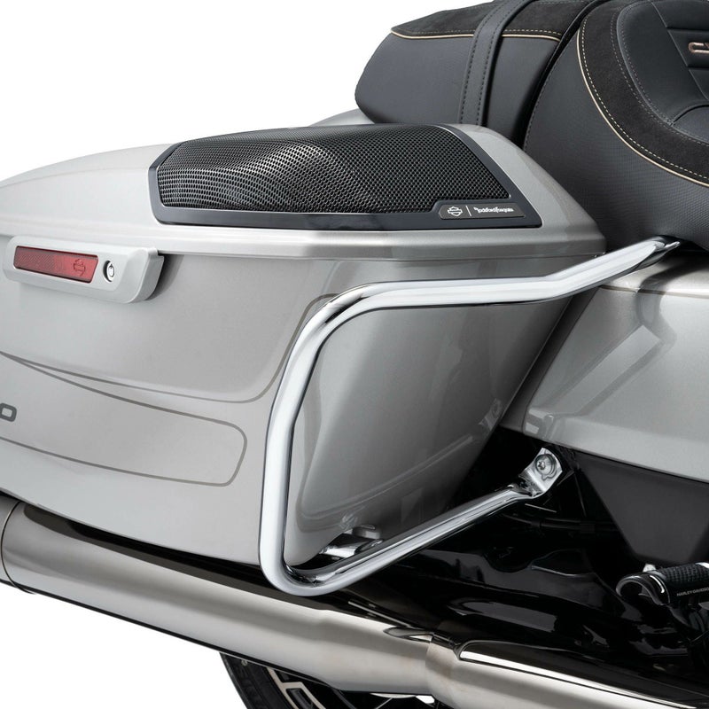CVOロードグライド、CVOストリートグライド用 リアサドルバッグガードです。 <特長> ●トラディショナルルックスのループスタイル、サドルバッグガードで愛車をドレスアップします ●立ちごけ等転倒時にサドルバッグおよびリア周りのダメージを軽減します ●ゴージャスなクロームメッキ仕上げ ●取付けに必要なハードウェア類が付属 ●左右ペア