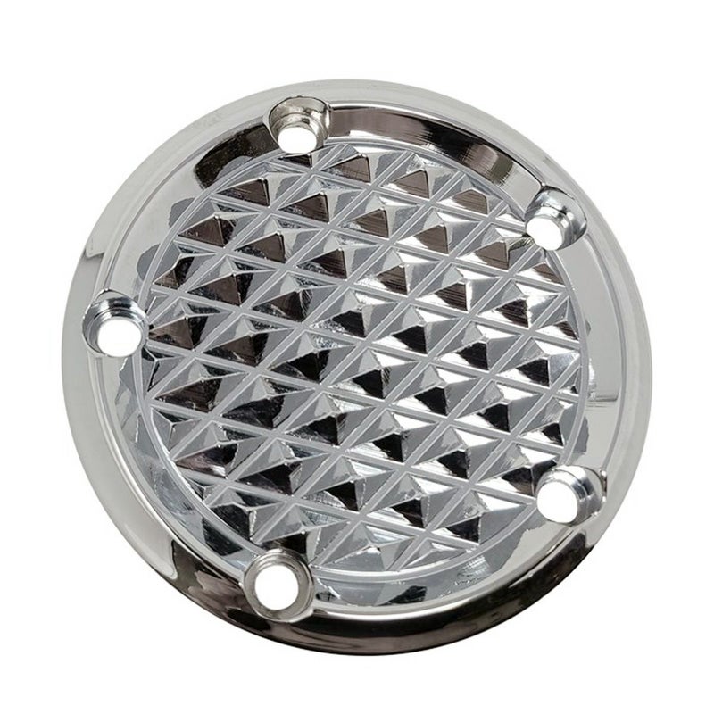 ツインカム ツーリング、ソフテイル、ダイナ 用 タイマーカバーです。 ビレットアルミニウム製。CNCマシン削り出し加工による精緻な仕上がりです。 ガラガラヘビのウロコを模した、ダイアモンドバックデザイン。 ゴージャスなクロームフィニッシュ。 同デザインのカバーパーツと組み合わせれば、カスタム感が更にアップします。