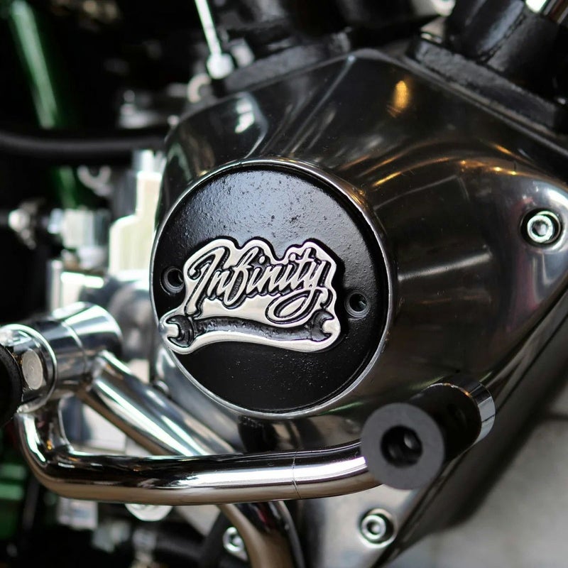 2004以降 XL スポーツスター、1970~1999 ショベル/エボリューション ビッググインエンジン搭載車用ポイントカバーです。 横方向の2穴仕様 こだわりの砂型鋳造で製作された、大変味わい深いアルミカバーです。 砂型鋳造品特有の、ビンテージ感溢れる質感。 センターにはINFINITY(インフィニティ)のビンテージテイストのロゴデザイン入りで、更に気分がアップします。 半艶ブラックのベースに、ロゴ部分はポリッシュ仕上げ。 ステンレス製スクリュー2本付属