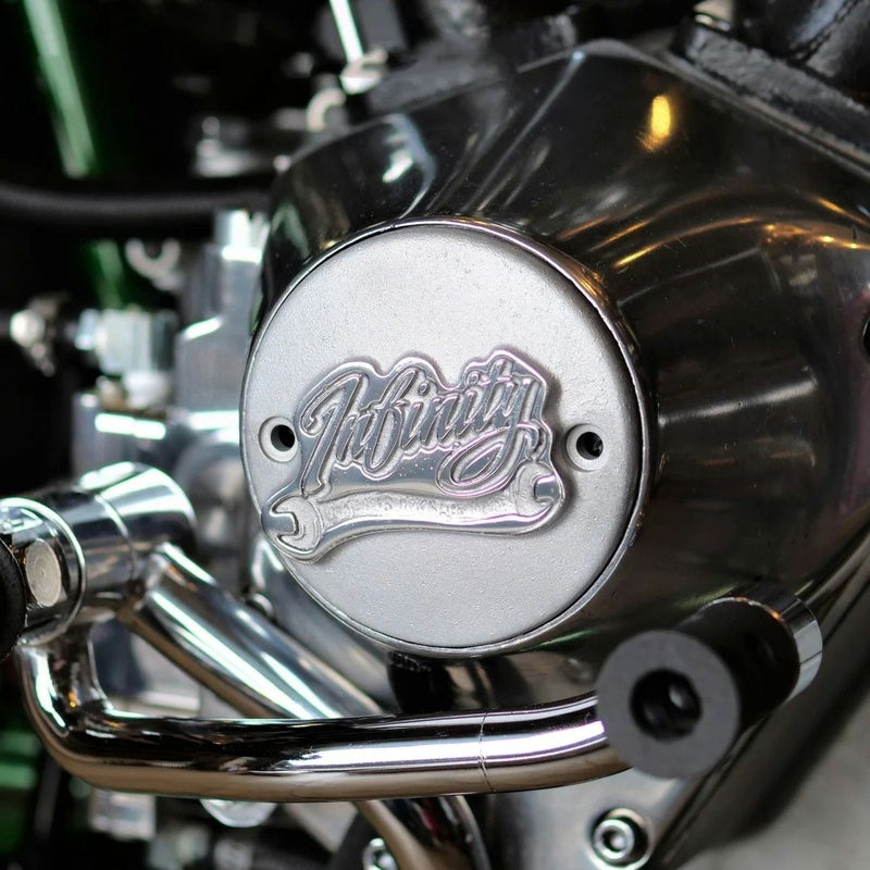 2004以降 XL スポーツスター、1970~1999 ショベル/エボリューション ビッググインエンジン搭載車用ポイントカバーです。 横方向の2穴仕様 こだわりの砂型鋳造で製作された、大変味わい深いアルミカバーです。 砂型鋳造品特有の、ビンテージ感溢れる質感。 センターにはINFINITY(インフィニティ)のビンテージテイストのロゴデザイン入りで、更に気分がアップします。 サンドブラスト処理のベースに、ロゴ部分はポリッシュ仕上げ。 ステンレス製スクリュー2本付属
