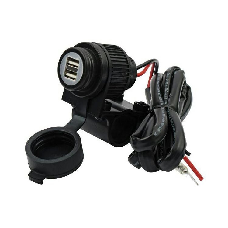 ハーレーのハンドルバーへ装着出来るUSB電源キットです。 1インチ径および7/8インチ径のハンドルバー用のクランプが付属します。 USBポート x 2口 アウトプット5V 2アンペア。 防水カバー付です。 120cmの配線付きです。 ※配線接続加工が必要です。
