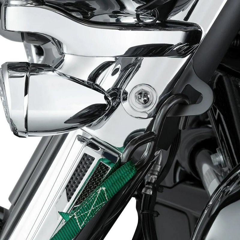 ハーレー ツーリング FLHT、FLHX バットウィングフェアリング標準装着車用 タイダウンブラケットです。 フロントフォーク側面のライトバーと共締めします。 輸送やメンテナンス時にフロントへタイダウンストラップを掛け易くなり便利です。 スチール製。 ブラックフィニッシュ。 左右ペア