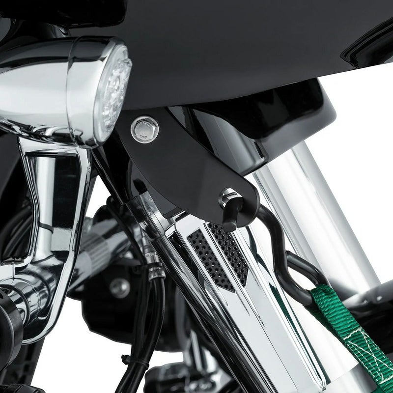ハーレー ロードグライド用 タイダウンブラケットです。 フロントフォーク側面のゲージハウジングと共締めします。 輸送やメンテナンス時にフロントへタイダウンストラップを掛け易くなり便利です。 スチール製。 カラーはブラック。 左右ペア