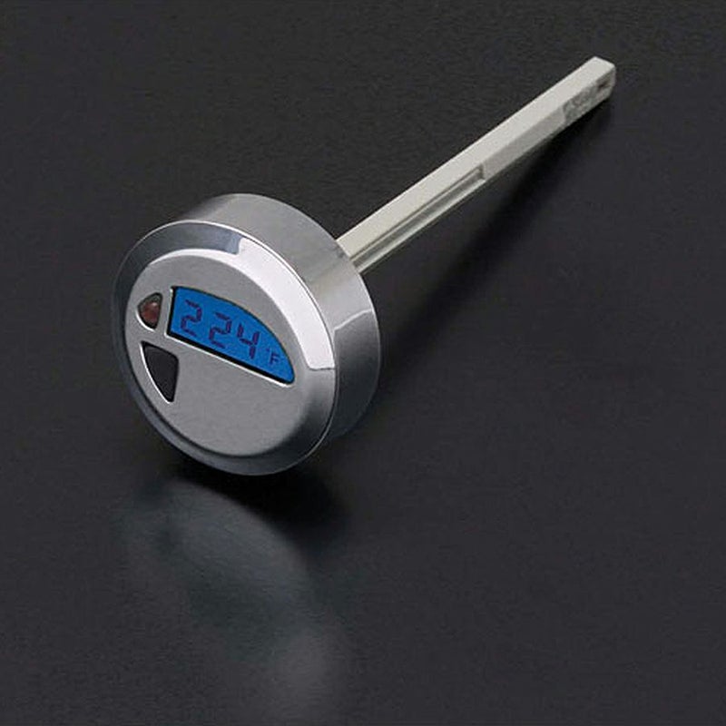 デジタル表示油温計付、オイルディップスティックです。 <特長> ●ブルーのバックライト仕様。 ●摂氏/華氏切替表示 ●クロームのボディ。キャップはラウンドシェイプ