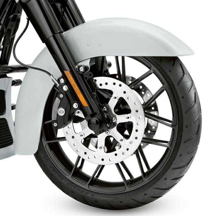 ハーレー ツーリング用の19インチフロントホイールです。 細身のスポークが片側14本ずつ、ハブからリム左右に出ています。どの角度から見ても立体感のある、唯一無二の凝った造形が人目を引きます。 カラーは精悍なグロスブラック。 鋳造アルミニウム製。 ハーレーダビッドソンの厳しい安全基準と耐久性をクリアしています。 装着には別売のホイールインストールキット(41454-08B)が必要です。 ※ブレーキローターは付属しません。
