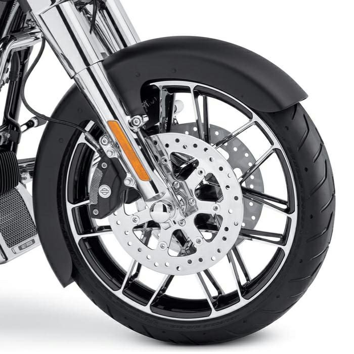 ハーレー ツーリング用の19インチフロントホイールです。 細身のスポークが片側14本ずつ、ハブからリム左右に出ています。どの角度から見ても立体感のある、唯一無二の凝った造形が人目を引きます。 ブラックのベースに、カット部分がミラーポリッシュの、コントラストカラーです。 鋳造アルミニウム製。 ハーレーダビッドソンの厳しい安全基準と耐久性をクリアしています。 装着には別売のホイールインストールキット(41454-08B)が必要です。 ※ブレーキローターは付属しません。