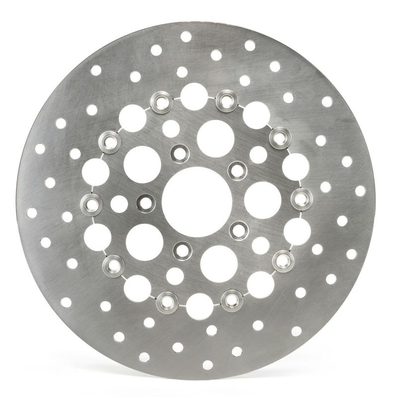スーパーバイクやパリ・ダカールラリー等の競技車用ブレーキパーツで実績のある、オランダMOTO-MASTERがハーレー用に作ったブレーキローターです。 車重が重いハーレーに対して確実なストッピングパワーを発揮します。 大小の穴の開いたKINGMAN(キングマン)デザイン。 旧いハーレーのブレーキディスクを彷彿とさせるルックス。 高品質ステンレススチール製。 CNCマシンによるレーザーカット加工で製作された精度の高い製品で、ブレや振動を発生しません。 センターキャリア部分とディスク面が別体のフローティング方式。センターキャリア部分はステンレススチールです。 ヨーロッパの安全認証機関(TUV)認証品。