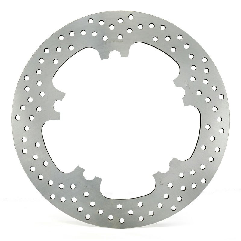 ハーレー ツーリング、トライク、ダイナ、Vロッド用 スポークマウント式 フロントブレーキローターです。 6.7インチ・ボルトサークルのハーフムーンボルトホールタイプです。 ディスク面に多数のドリルホールを開けたHALO(ハロ)デザイン。 軽量化と放熱効果の高い仕様です。 高品質ステンレススチール製。 CNCマシンによるレーザーカット加工で製作された精度の高い製品で、ブレや振動を発生しません。 ヨーロッパの安全認証機関(TUV)認証品。 ※写真は現物と細部が異なります。(参考写真)
