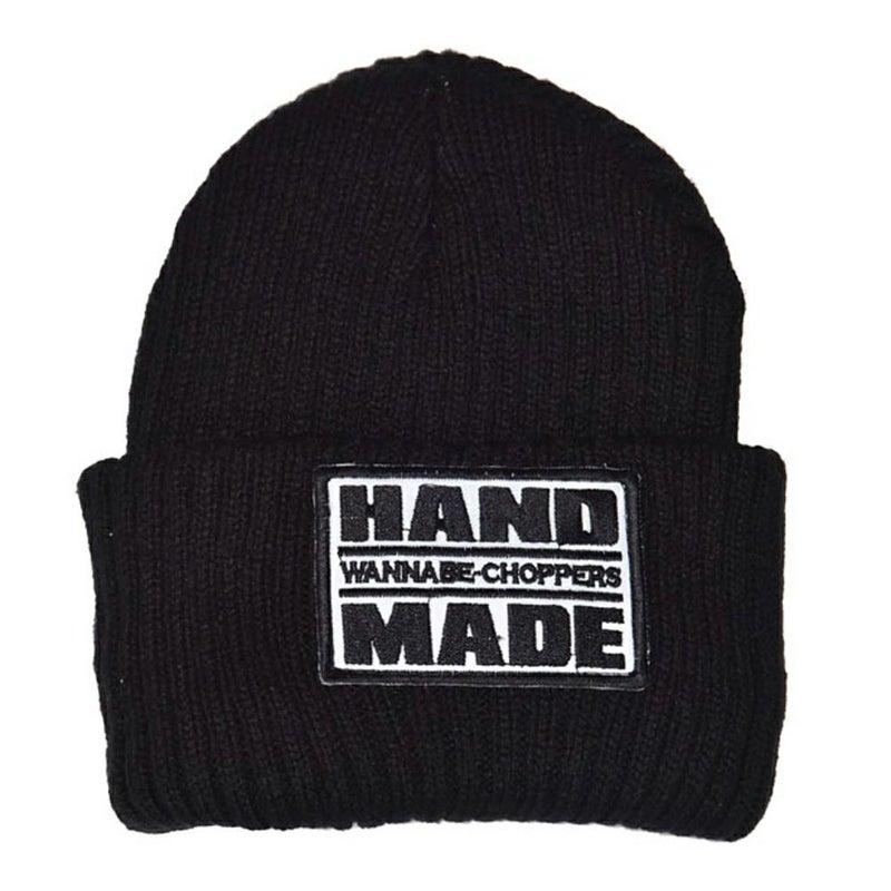 Wannabe choppersのHand Madeロゴニットキャップ。 様々なシーンで活躍でき、裏地はフリース素材なので寒い冬に最適です。 ポリエステル100%