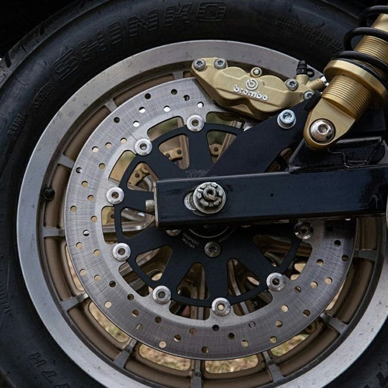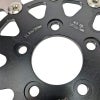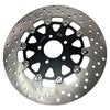ツーリング用 リア・フローティングブレーキローターです。 フルフローティング構造で、熱によるローター全体の変形を最小化し、ハードな使用でも常に安定したブレーキ性能を発揮します。 ディスクは炭素含有量の多い、420ステンレススチール製。熱処理により高強度、高硬度で耐久性に優れた素材です。 レーザーカットで製作されており、歪みの少ない仕上がり。更に精度の高い研磨加工でブレーキパッドとの当たりが均一になります。 キャリア部分はアルミビレットをCNCマシンによる切削加工で製作しており、軽量かつ頑丈です。耐腐食性の高いブラックカラーのアルマイト仕上げ。 リベットはステンレススチール製。アルミリベットよりもディスクの熱をキャリアへ伝えずらく、かつ頑丈です。スプリングワッシャー付きで、フローティングピンのがたつきを抑えます。 単品販売