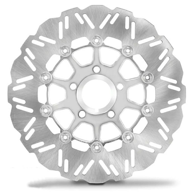 11.5インチ径のフロント用ブレーキローターです。 センターキャリアとディスクをリベットで連結するフローティング式。 熱によるローターの変形を抑え、ハードな使用でも安定したブレーキ性能を発揮します。 見た目のドレスアップ効果も高いルックスです。 ディスクは410ステンレススチール製。 センターキャリアはアルミニウム製。放射状にスポークが伸びるSS(スーパースポークデザイン) センターホールスペーサー(1999以前純正ホイール用)が付属します。 ※ボルトサークル3.25インチ径のハブマウント式ホイール用です。 ※スポークマウントディスク式ホイール不可 ※パフォーマンスマシン、ローランドサンズ等の社外ホイールで、専用ローター仕様のものには適合しません。