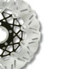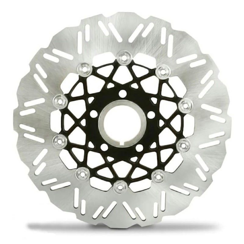 11.5インチ径のフロント用ブレーキローターです。 センターキャリアとディスクをリベットで連結するフローティング式。 熱によるローターの変形を抑え、ハードな使用でも安定したブレーキ性能を発揮します。 見た目のドレスアップ効果も高いルックスです。 ディスクは410ステンレススチール製。 センターキャリアはアルミニウム製。メッシュ状のスポークデザイン。 センターホールスペーサー(1999以前純正ホイール用)が付属します。 ※ボルトサークル3.25インチ径のハブマウント式ホイール用です。 ※スポークマウントディスク式ホイール不可 ※パフォーマンスマシン、ローランドサンズ等の社外ホイールで、専用ローター仕様のものには適合しません。