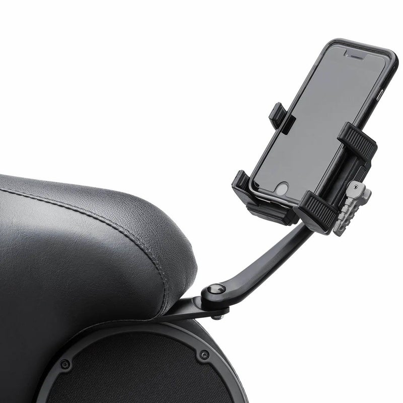 ツアーパックのバックレストに装着するスマートフォンマウント。 パッセンジャーがスマートフォンでナビゲート出来るようになり非常に便利です。 スイングアウェイマウントによりパッセンジャーを妨げる事無く乗り降りが出来ます。 本体は金属製で耐久性に優れています。 ツアーパックの右側でも左側でも取り付け出来ます。 ※デバイスホルダーは別売りです。CIRO製のホルダーが使用可能です。 ※ツアーパックにスピーカーポッドが付いていない場合は取り付け出来ません。