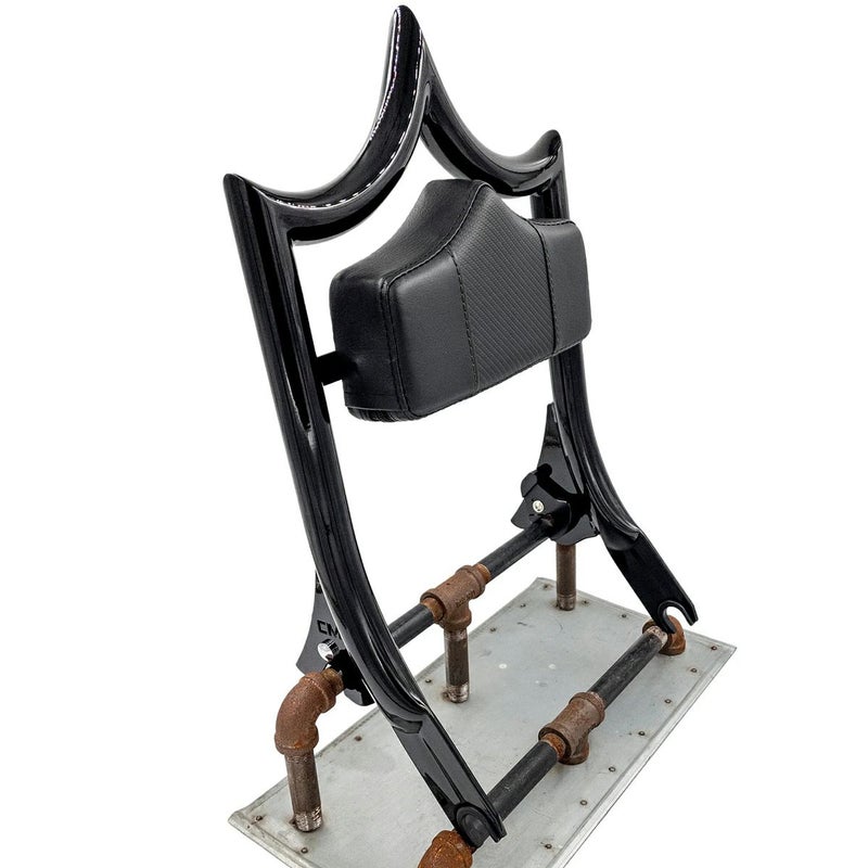 ハーレー 2009以降ツーリング用 パッセンジャーバックレストとバックレストパッドのセットです。 バックレストは迫力ある1.25インチ径パイプとクラウンシェイプが特徴の、EL REY(エルレイ)デザイン。 通常のClassic(クラシック)よりも2インチ高いDOS EQUIS(ドスエキス)=ダブルエックス サイズ。 チカーノスタイルのCMC(カスタムモータースポーツ)らしいネーミングとルックスです。 付属のバックレストパッドはバックレストと同形状。カーボンファイバー柄のセンタートリムを配したデザイン。 同デザインのソロシート・ピリオンパッドのセット(SOSEAT08T-CARFIB-BLK)と組み合わせれば愛車をゴージャスにドレスアップ出来ます。 純正ドッキングポイントにワンタッチで着脱出来ます。 脱落防止用アルミ製回転式ラッチ付きです。 ※ご注文時にオプションのカギ付きラッチ(BLK-HDLOCKABLE)を同時購入すればバイクを離れる際の盗難対策も万全です。