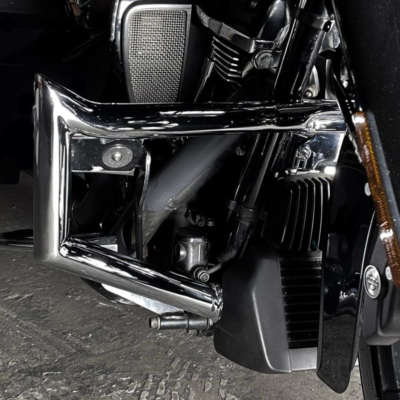 2013以前 ツーリング用 1.5インチ径 チョップドエンジンガードです。 <特長> ●1.5インチ径の極太パイプ。1.25インチ径のノーマルエンジンガードと一線を画す迫力 ●CMC製ーシーバーやELEV8ハンドルバーとの組み合わせにも最適 ●アグレッシブなポインテッドシェイプ ●ゴージャスなショークロームフィニッシュ ●取付けに必要なハードウェアが付属します ※ロードグライドはフェアリングサポートブラケットの交換が必要です。 ※フロントの荷重が増すため、フロントサスが底付きする場合はバンプストッパーの装着や硬いスプリングへの変更等の対策が必要です。