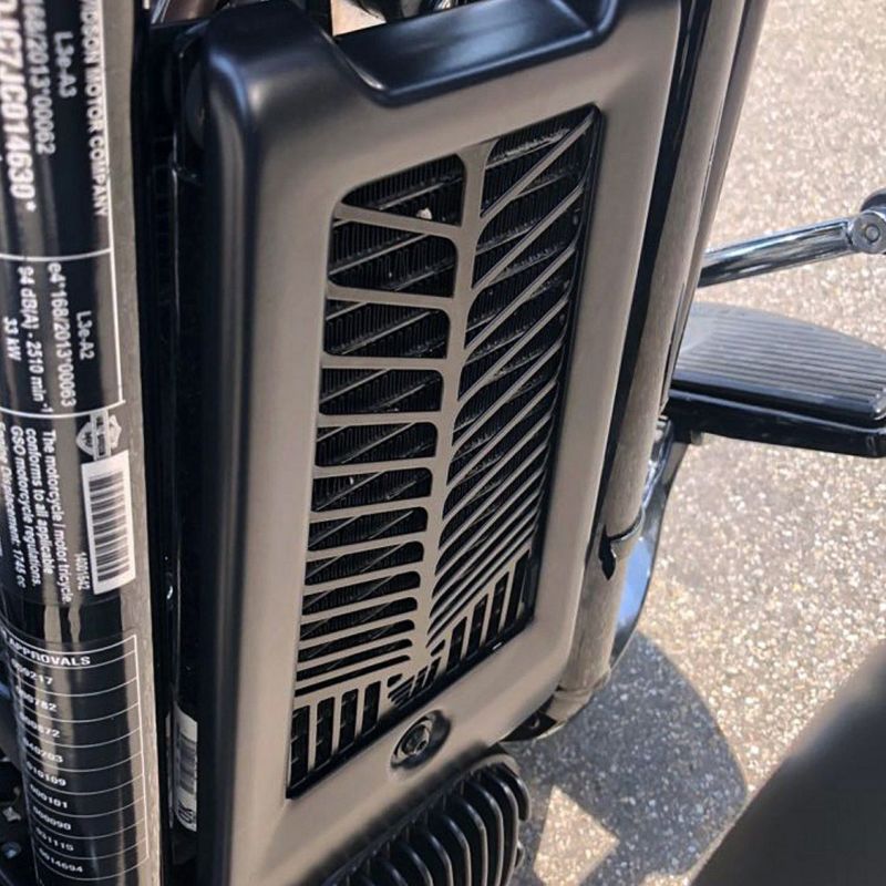 M8ソフテイル用 オイルクーラーカバーです。 大きな飛び石等から大切なオイルクーラーをガードし、外観もドレスアップします。 ノーマルのオイルクーラーパネルとオイルクーラーの間に装着するだけです。 スチール製。セミマットブラックカラーの樹脂コート仕上げ。 擦れやひび割れ防止用のラバーバンパー付きです。