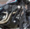 横幅の狭いエンジンガードです。 センターからの張り出しは3インチ(約8cm)。純正のエンジンガードよりも1.5インチ(約4cm)狭くなっています。 いざという時にライダーとバイクをガードする機能は確保しつつ、すり抜けやスタントライディング時にも邪魔にならない大きさです。 パイプ径は1.25インチ。0.125インチ(約3.2mm)厚のスチールパイプ製です。 純正フォワードコントロール併用可。
