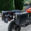 ハーレー パンアメリカ用のアルミサイドパニア左右および、アルミサイドパニア用サブフレームのセットです。 サブフレームは車種専用設計ですので、ボルトオンで装着出来ます。 パニアはバッグ内側のレバーの開閉だけでサブフレームに脱着できます。 パニアは角をカットしたクラシカルでエレガントなデザイン。厚さ1.5mmのアルミ製。リア部分は厚さ3mmに補強されています。 マットブラックパウダーコートフィニッシュ。 イタリアの職人による手作り品です。 角部分はABS樹脂製のバンパー付き。 リッドはキーロック出来ます。 リッド裏面はバンジーコードをひっかけるアンカー付き。付属のバンジーコードで小物を止めるのに便利です。 ケース内側はベルクロで脱着可能な厚さ2.5mmのソフトなネオプレン製内張付きで、荷物を保護します。 取付けに必要なボルト類が付属します。