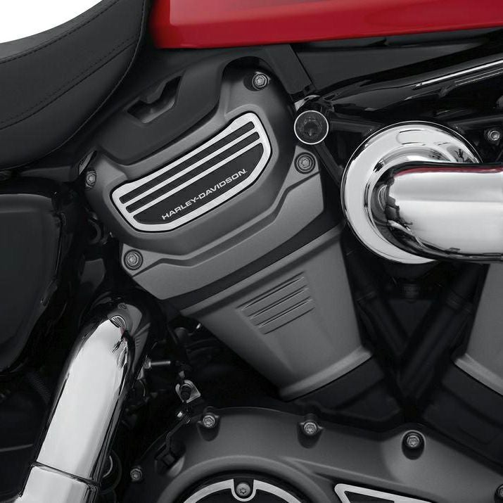 ハーレー Revolution Maxエンジン用、カムスプロケットメダリオンです。 1960年代のハーレータンクエンブレムをイメージした、グロスブラックのベースにブラシフィニッシュのアルミカラーのコントラストが、レトロモダンなデザイン。 ブラックアウトされた車体にも、クロームのパーツにもマッチします。 同デザインのクラッチメダリオン等と組み合わせれば、統一感のあるルックスになります。 ノーマルのカバーをプラスチックプライヤ―や釣り糸などで周囲を傷つけないように剥がし、付属の両面テープで貼り付けます。 2個セット