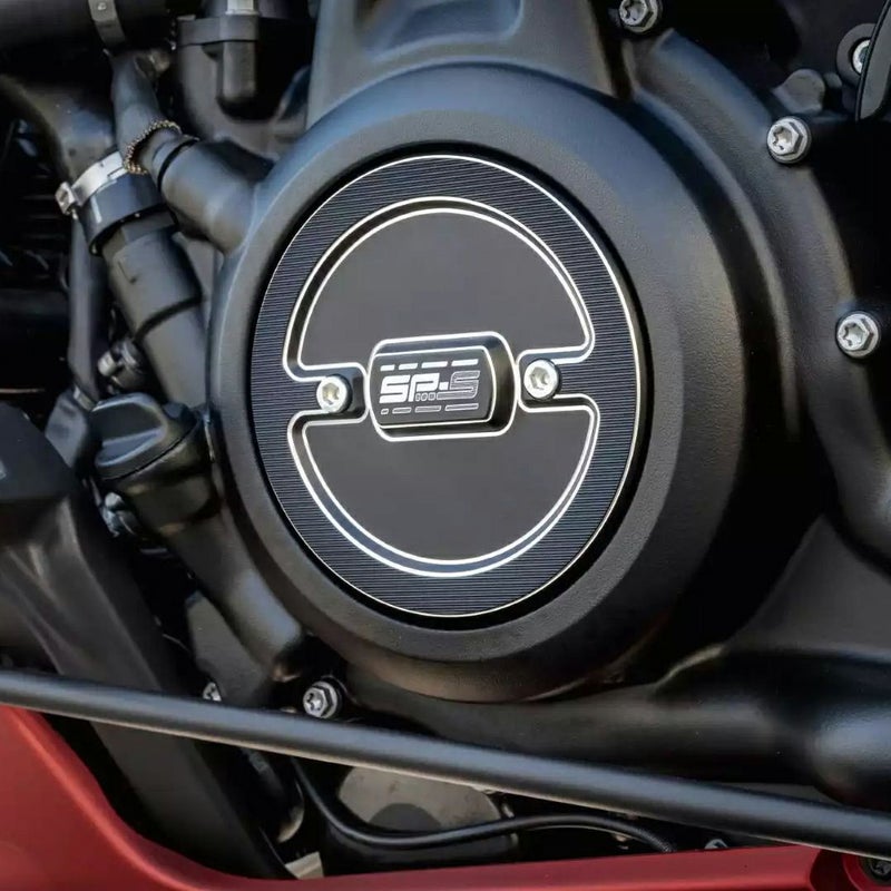 ハーレー スポーツスターS、ナイトスター RH975、パンアメリカ用 オルタネーターカバーです。 アルミニウム製。CNCマシンによる精緻な削り出し加工品です。 ブラックのベースにシルバーのコントラストカラー。 同デザインのThunderbike(サンダーバイク)製クラッチカバー(22-85-060)やイグニッションカバー(22-85-070)と組み合わせれば、より統一感のあるカスタムルックになります。 単品販売