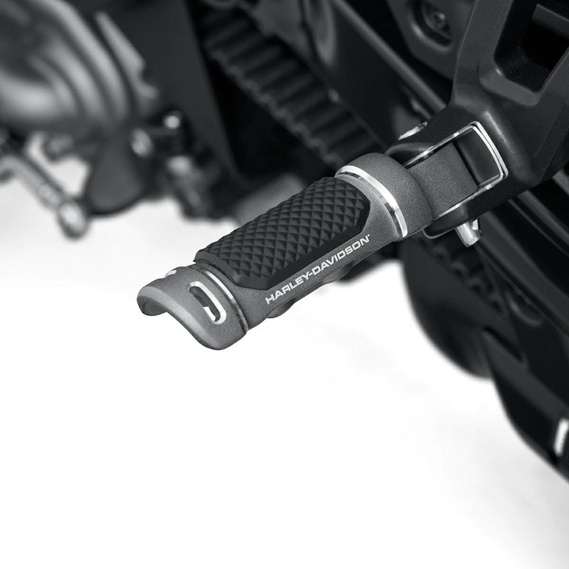 ハーレー Revolution Max搭載車用パッセンジャーフットペグです。 鍛造アルミニウム製。 グラファイトカラーのベースに、精緻にマシンカットされた部分のアルミシルバーのコントラストがアグレッシブでハイパフォーマンスなイメージを演出します。 滑り止めナールパターンのラバーもデザインアクセントになっています。 左右ペア