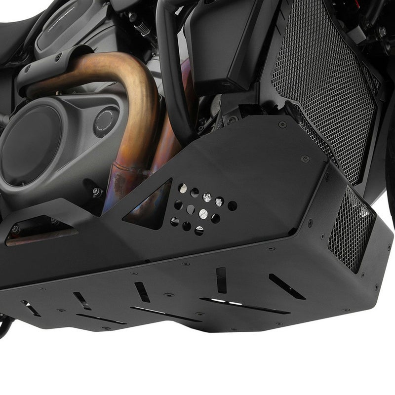 パンアメリカ/スペシャル用 エンジンアンダーガードです。 パンアメリカのエンジン下部にはエキゾーストパイプ、キャタライザー、オイルタンク、クーラントタンク、バッテリーといった大切なパーツがあります。それらのパーツをカバーし障害物や撥ね石によるダメージから守ります。 ロードクリアランスやバンク角を損なわないよう、タイトにフィットし、同時にフロント部のメッシュグリルからのエアの取り込みによる冷却効果やオイル交換時のメンテナンス性にも配慮された設計です。 厚さ3mmの高強度アルミプレート製。左右およびセンターパネルの3ピース構造。4箇所の防振ダンパーで振動による破損にも対応しています。 ブラックのパウダーコート塗装仕上げ。 ※純正エンジンガードとの併用不可 ※純正センタースタンド併用不可 取付けに必要なハードウェアが付属します。