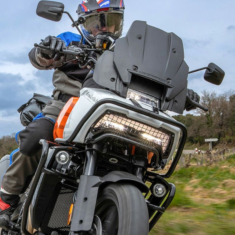 パンアメリカ/スペシャル用 ヘッドライトグリルです。 ワイルドなイメージのグリル形状。 撥ね石や木の枝等の障害物によるヘッドライトへのダメージを防ぎます。 アドベンチャーバイクらしい雰囲気を更に強調します。 可倒式のため、掃除の際は倒せばヘッドライトを掃除するのに邪魔になりません。 ステンレススチール製。ブラックのパウダーコート塗装仕上げ。 取付けに必要なブラケット、ハードウェアが付属します。