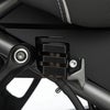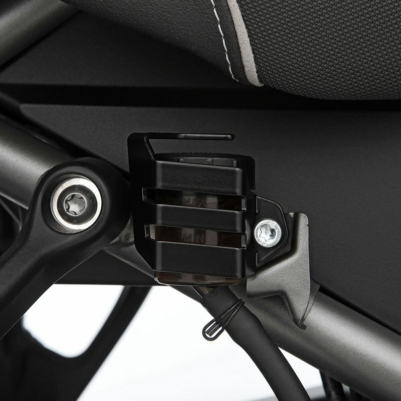パンアメリカ/スペシャル用 リアブレーキフルードタンク(マスターシリンダー)ガードです。 剥き出しのタンクを転倒や撥ね石等の障害物によるダメージから守ります。 前・後・側面と上面をしっかりとガードしてくれます。 同時に全面を覆わない構造とし、フルード量の確認も可能です。 上面のガードは、タンクキャップへのいたずら防止にも役立ち、安心です。 厚さ2mmの頑丈なアルミニウムプレート製。 ブラックのパウダーコート塗装仕上げ。 取付けに必要なハードウェアが付属します。