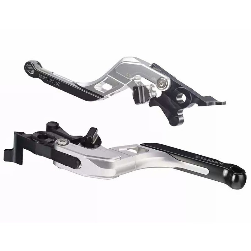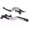 スポーツスターS、ナイトスター/S、パンアメリカ/S用 アジャスタブル・ハンドレバーセットです。 レバーの遠さ、レバーの長さを調整できます。 レバーの遠さは手の大きさや好みに応じて6段階に調整可能。 レバーの長さは5cm~8cmの範囲で調整可能。ハンドコントロールの指のかけ方に応じて調整出来ます。 更に転倒時にはレバーの途中から上向きにフォールドして力を逃がし、レバーが折れるのを防ぎます。 素材は軽量で特にねじれに強いアルミニウム製。CNCマシンによる削り出し加工品。 表面には腐食に強いアノダイズ処理済みです。 左右ペア