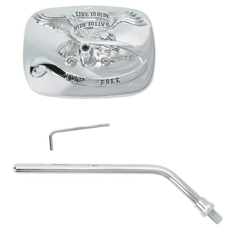 LIVE TO RIDE RIDE TO LIVE の文字とアメリカンイーグルが浮き彫りされた、ゴージャスなミラー。 アメリカンクルーザーにベストマッチします。 ハウジングはアルミダイキャスト製。 ステムはM10逆ネジです。 ハーレーはRHモデルの右ハンドルマウント用として使用出来ます。 ※スポーツスターS、ナイトスターは別売ミラーマウント付ハーフクランプ(41700623)が必要です。 右用 単品販売
