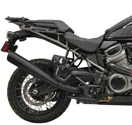 ハーレー パンアメリカ用 スリップオンマフラーです。 歯切れの良いスポーティーなサウンドを奏でます。 精悍なブラックカラーです。 マフラーボディはメガホンタイプ。 最大4インチ径。ステンレススチール製。 ビレットアルミニウム製エンドキャップ付きです。 3インチ径x2.5インチの、脱着可能な穴あきバッフル付です。 部分ヒートシールドが付属します。