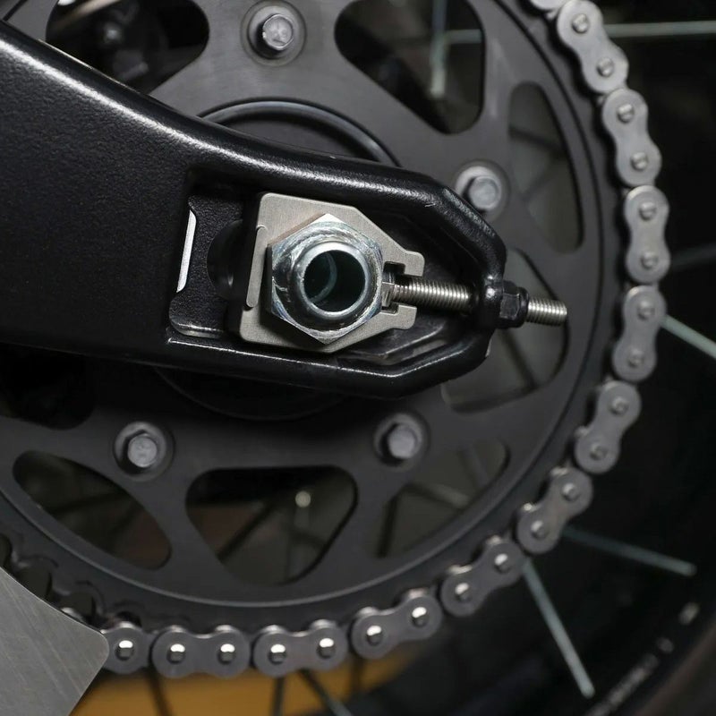 ハーレー パンアメリカ用 チェーンアジャスターブロックです。 頑丈な6061-T6ビレットアルミニウム製。 ハードアノダイズ処理済みで、安心して使用出来ます。 また、ノーマルアジャスターに較べて見た目も高級感が増します。 左側はアクスルナットの脱落防止のため、アクスルナットの回転を抑えるリブ付きです。 左右セット