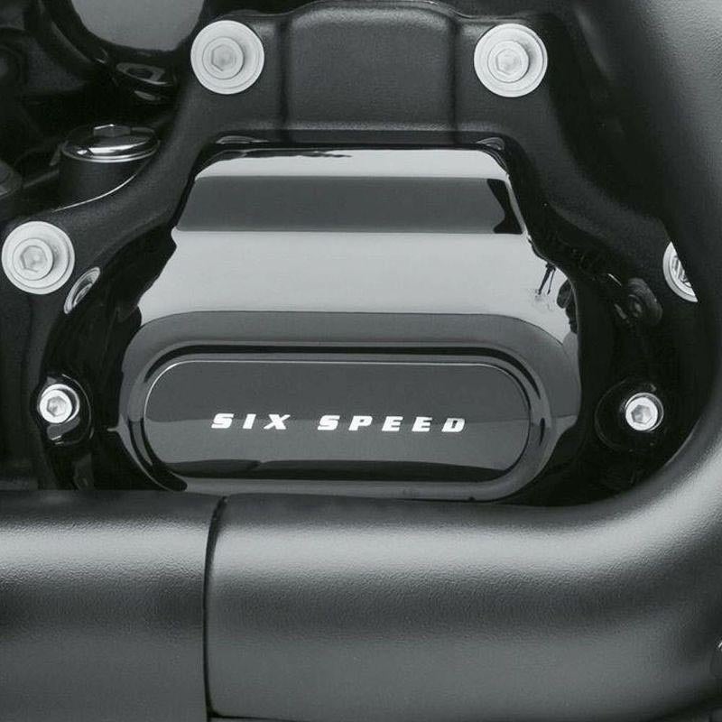ミルウォーキーエイトのエンジン回りをグロスブラックのダークなルックスに変更。 仕上げには耐久性を高める耐熱塗装を施されています。 ※写真の SIX SPEED のプレートは含みません。