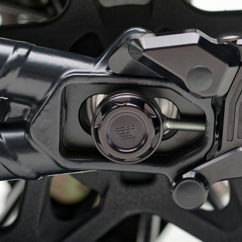 M8ソフテイル、スポーツスターS用 リアアクスルカバーセットです。 王冠を模ったクラウンデザイン。剥き出しのリアアクスルナットをカバーすることで、クリーンでスペシャル感溢れるルックスにドレスアップします。 素材はアルミニウム。CNCマシンによる削り出し加工品です。 ブラックパールカラーのアルマイト仕上げ。 左はワンダーカインドのロゴマーク入り。 左右セット