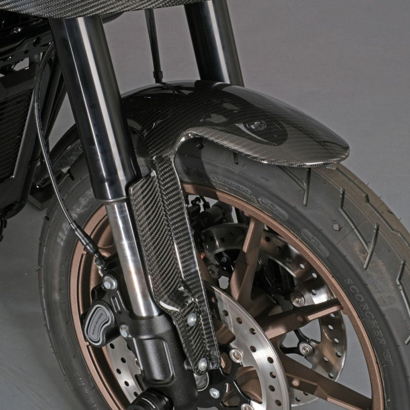 M8 ソフテイル ローライダーS/ST用 ドライカーボン製 カスタムフロントフェンダーです。 <特長> ●超軽量・超高強度を誇る、ドライカーボン製。 ●綾織りカーボン柄のスポーティーなルックスで愛車をドレスアップします。艶消し仕上げ ●UVカット加工済み。紫外線による劣化を防ぎます