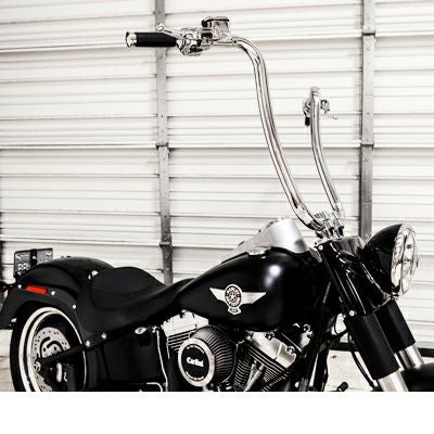 両腕を前に突き出す プッシュフォワードスタイル のエイプハンドルバーです。 ライズ部分が前方へカーブを描くスタイルが独特です。 ハンドル径は極太の1.5インチ径。 クランプ部分も1.5インチ径です。 ※クランプ部1.5インチ径のライザーが必要です。 配線中通し用の穴が開いています。 ハンドコントロール部は1インチ径。 油圧クラッチ車にも対応します。 電子制御スロットル用の切り欠きが付いています。 ※切り欠きを塞ぐプラグが付属していますので、ケーブルスロットル車にもそのまま使用できます。電子制御スロットル車に使用する際はプラグを外してください。 ※2015以降ロードグライド不可