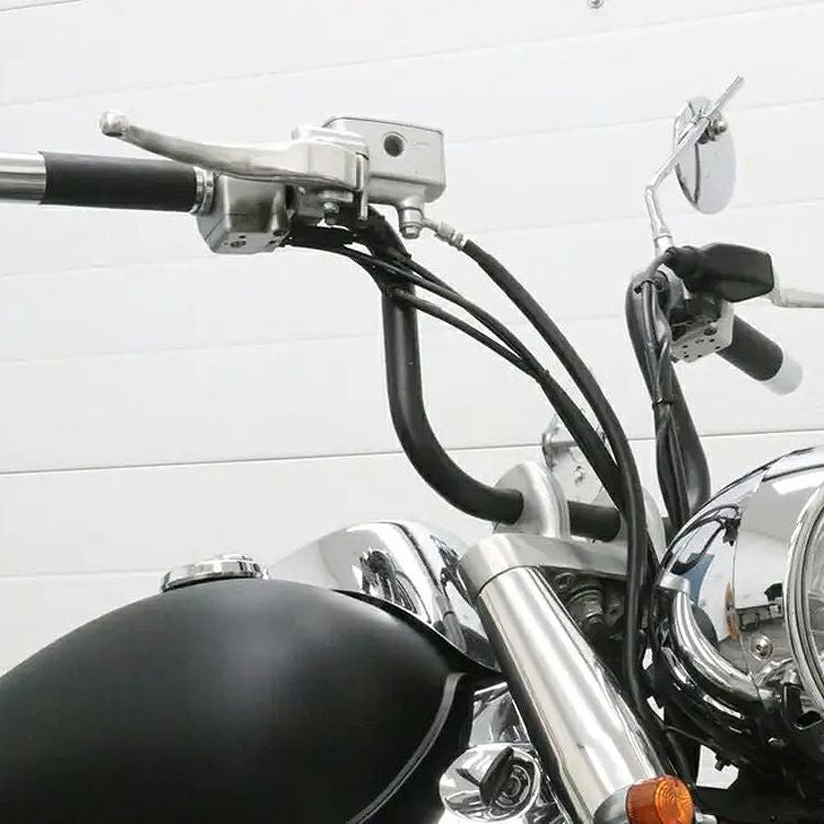 ハーレー用 エイプハンドルバーです。 やや広いボトムからナローなトップにかけて内側に絞り込まれたライズが特徴の、ミニエイプバーです。 スポーツスター、ダイナのチョッパー、ボバースタイルに似合います。 厚さ0.109インチ(約2.8mm)のスチールパイプ製。 CNCマンドレル曲げで作られており、スムースで綺麗な曲線です。 ハンドル径は1インチ。 ※ハンドル配線逃がし用のディンプルの無い、スムースタイプです。 ※1982年以降のハーレースイッチボックスは配線を逃がす切り欠きが無いため、このハンドルに装着すると配線を損傷します。 ※ケーブルスロットル車用