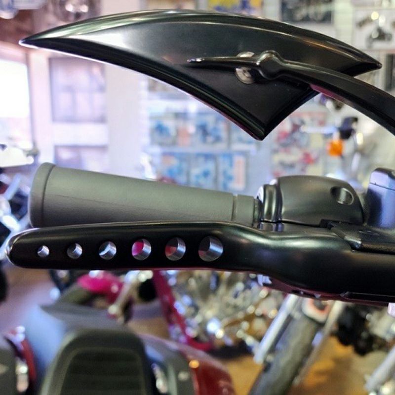 2015以降 ソフテイル用 ハンドレバーセットです。 先端に向けて細くなるシェイプにレバーの幅に合わせた6個の穴が並んだクールなルックスです。 アルミニウム製。 クールなブラックのパウダーコート塗装仕上げです。 ケーブルクラッチ車用。 ※2016~2017 FLSS、FLSTFBS不可 左右ペア