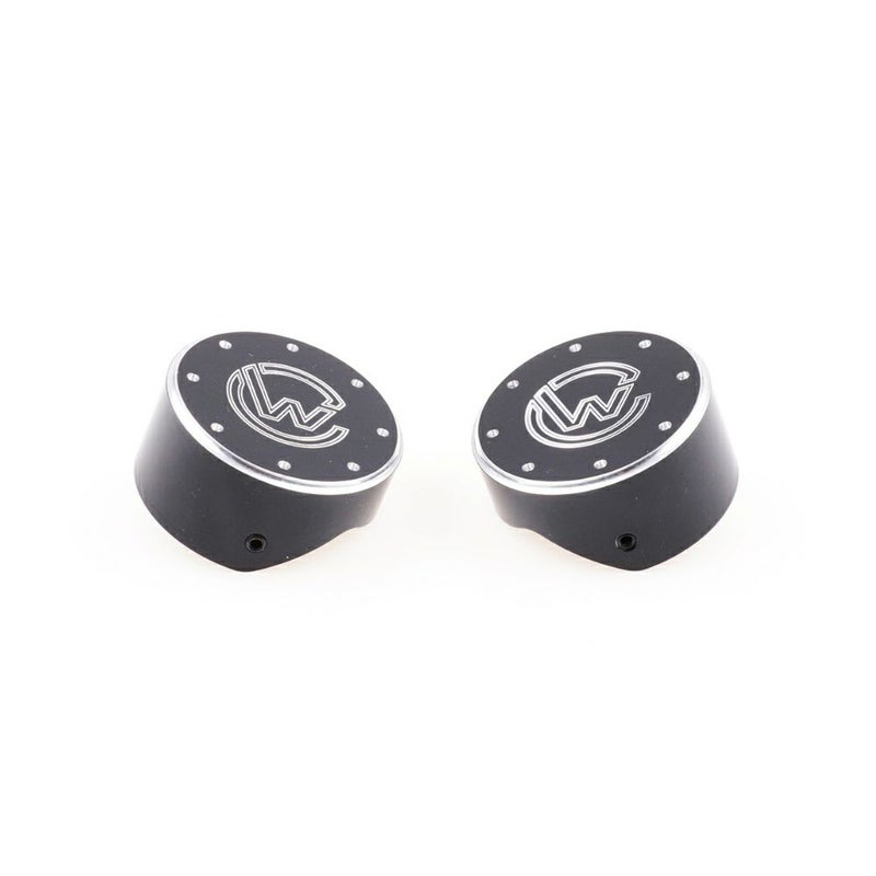 メーカーロゴ入りのアルミ製フォークキャップ。 ●CWロゴが刻印されています。 ●グロスブラックのパウダーコーティングを施したアルミ製カバー。 ●フォークキャップボルトの上に装着し、イモネジで固定します。 ●左右2個セット。