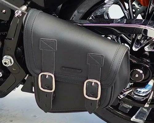 M8ソフテイル用 デタッチャブル・スイングアームバッグです。 バッグはスイングアームバッグ形状ですが、専用ステーで車体側にマウントするので、バッグとスイングアームが接触せず、スイングアームの塗装も痛めません。 専用ステーをリアフェンダーサポートのマウント位置に取り付けます。 バッグを使わない時は、専用ステーごと簡単に取り外せるので大変便利です。 ステーはパウダーコート塗装仕上げ。 バッグ本体はサドルマン製。 蓋の開閉はクイックリリースバックル付きのストラップで簡単です。バックルはキーロック付きですので、バイクを離れる際も安心です。 左用