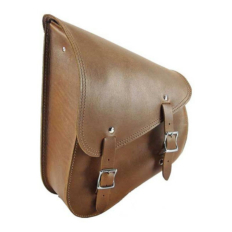EVO/TC ソフテイル用 本革製スイングアームバッグです。 <特長> ●デジタブルタンニンなめしのベルギー産本革を使用。使い込むほどに味わいの出るバッグです ●EVO/ツインカム ソフテイルのスイングアームに合わせた設計。付属のレザーストラップで簡単に取り付け可能 ●耐候性の高いダブルフラップ構造。内蓋はベルクロで簡単に開閉可能 ●背面は型崩れ防止用樹脂製バックプレート仕様 ●左用。単品販売 ※純正サドルバッグとの併用不可 ※スイングアームバッグ装着時はタンデムステップを使用できません。