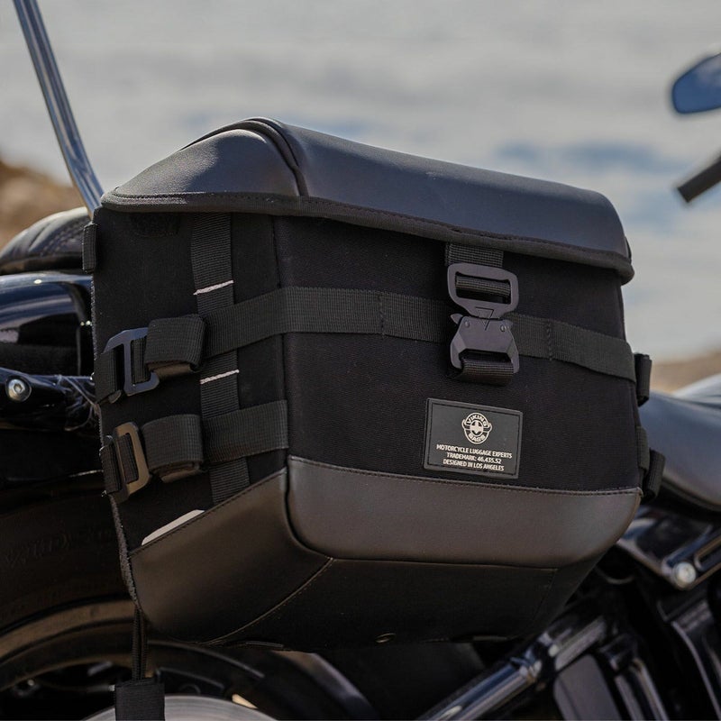 M8 ストリートボブ、スタンダード用 デタッチャブル・ソフトサドルバッグです。 <特長> ●丈夫なナイロンキャンバスとシンセティックレザーの組み合わせによる、軽量かつ耐久性に優れたサドルバッグ ●小ぶりなサイズでスリムなデザインにマッチします ●付属の車種用マウントをフェンダーストラットに装着すれば、あとはワンタッチで着脱出来ます ●キーロック機構付きでバッグの盗難を防止します ●クイックリリースバックルで蓋の開閉も簡単 ●内部は補強材入りで型崩れを防ぎます ●リアウィンカー移設不要 ●蓋には持ち運びに便利なキャリーハンドル付 ●ショルダーストラップ付属 ●取付け用ハードウェア、スペーサー付属 ●右側のみ。単品販売